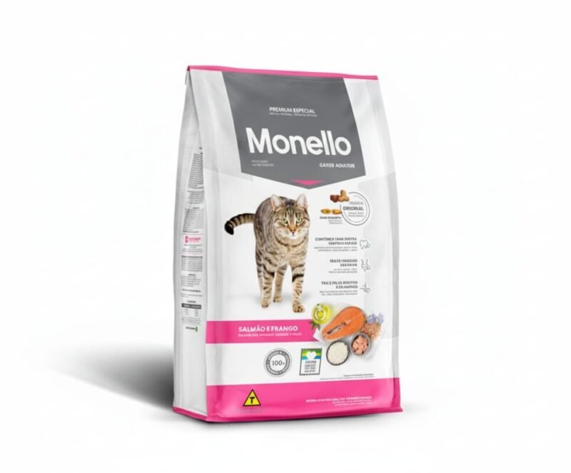 Monello Premium Especial Adult Cat Food is a complete and balanced nutrition formula designed for adult cats. Made with high-quality salmon and chicken, this diet provides essential proteins, vitamins, and minerals to maintain ideal body condition, muscle strength, and overall vitality.